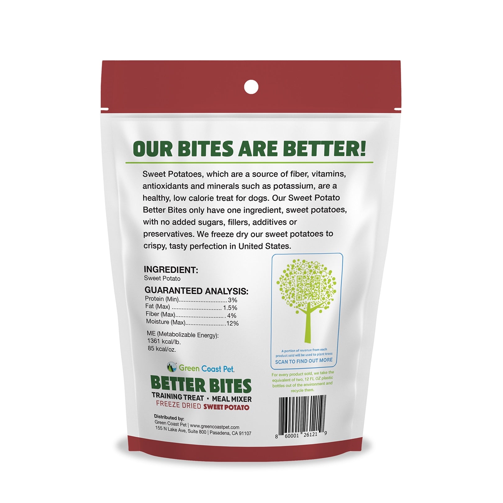 Our Sweet Potato Better Bites are less than 1 calorie a piece and have only one ingredient, sweet potato, with no added sugars, fillers, additives or preservatives. Sweet Potatoes, which are a source of fiber, vitamins, antioxidants and minerals such as potassium, are a healthy, low calorie treat for dogs.