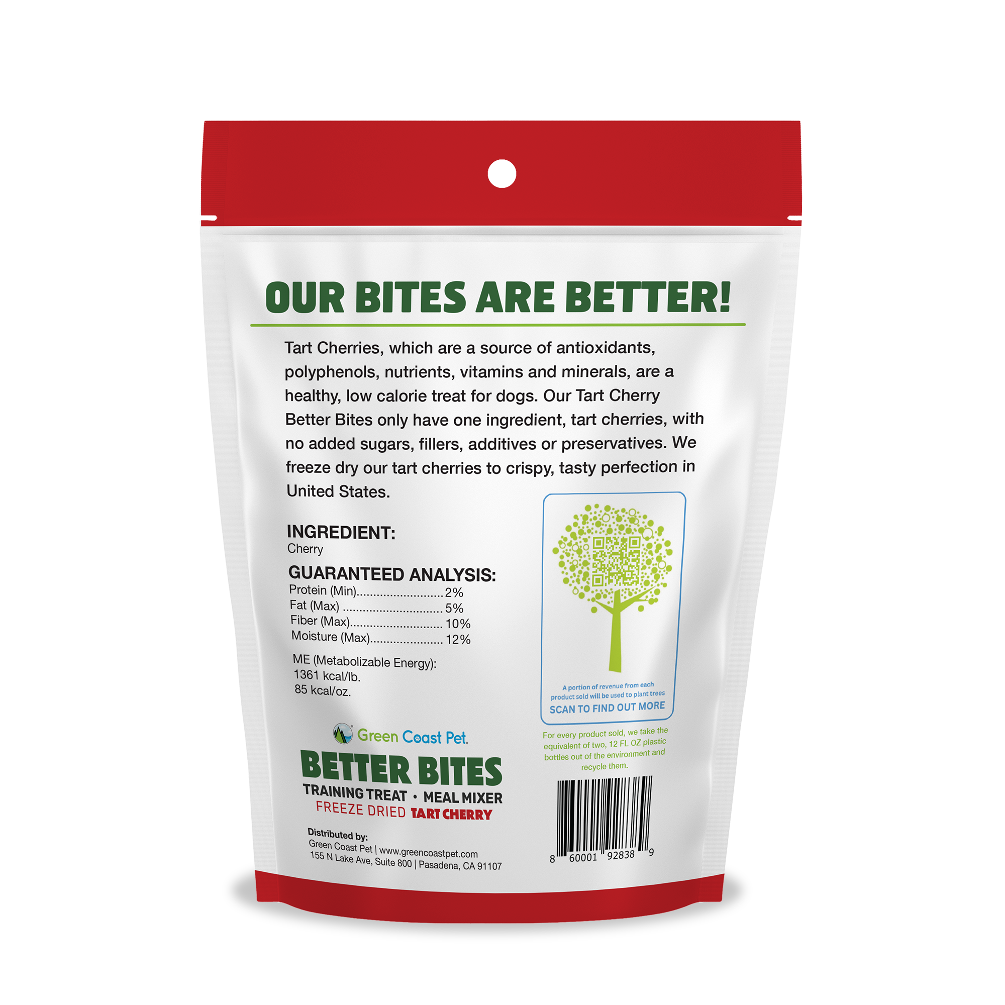 Our Tart Cherry Better Bites are less than 1 calorie a piece and have only one ingredient, tart cherry, with no added sugars, fillers, additives or preservatives. Tart Cherries, which are a source of fiber, vitamins and antioxidants are a healthy, low calorie treat for dogs.