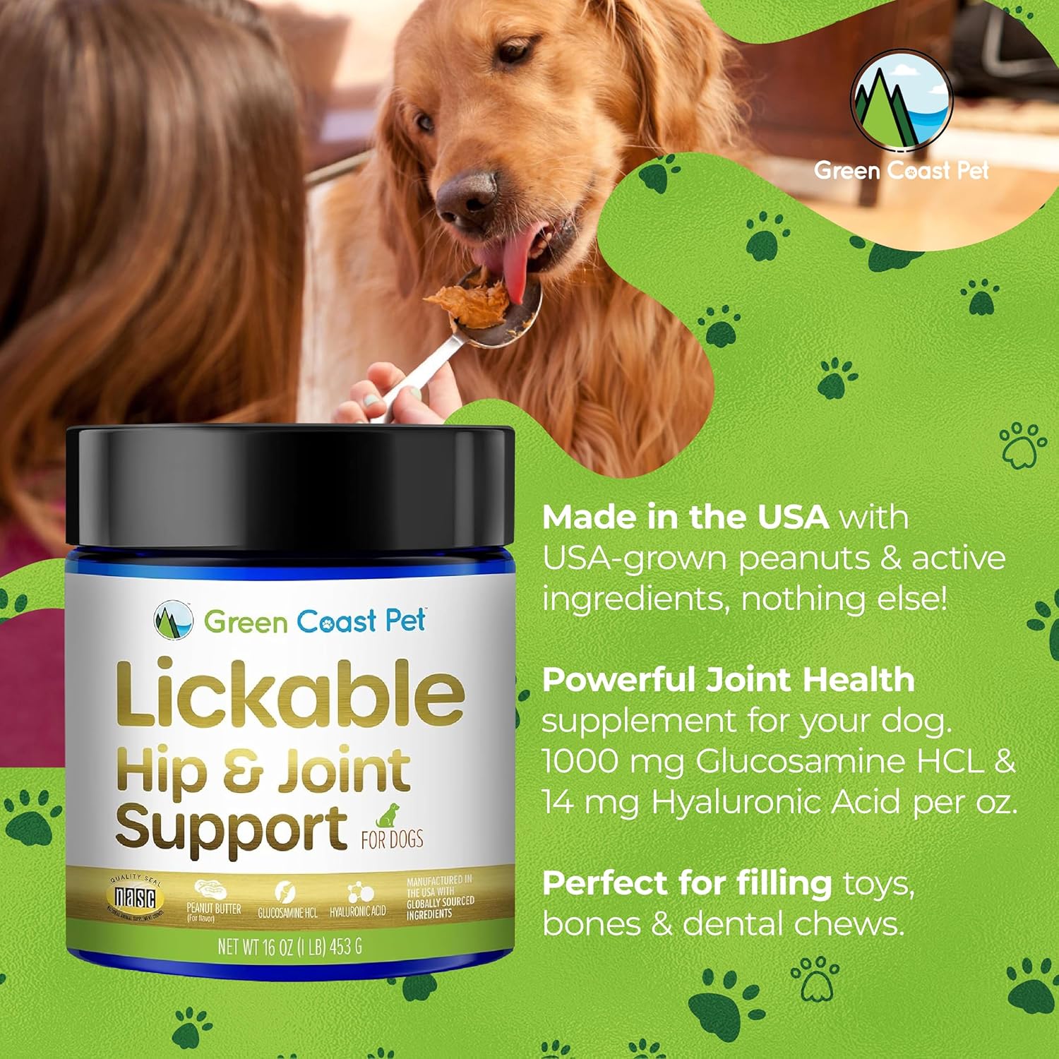 Each jar has 16,000 mg glucosamine, 9600 mg chondroitin, 8000 mg MSM and 224 mg Hyaluronic Acid. You can use Lickable Hip and Joint Support to fill a toy or a lickmat to make giving your dog supplements fun or give it to your dog right off the spoon.
