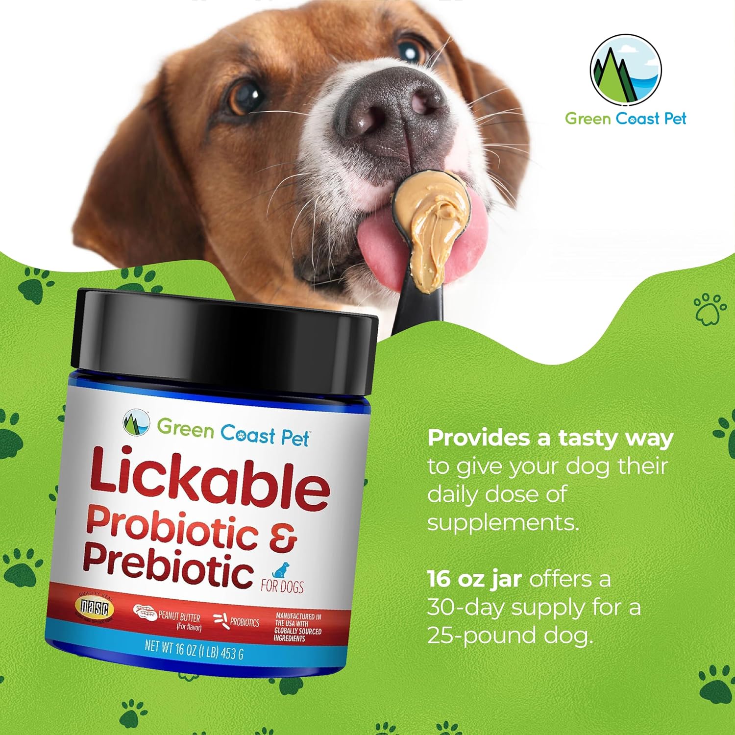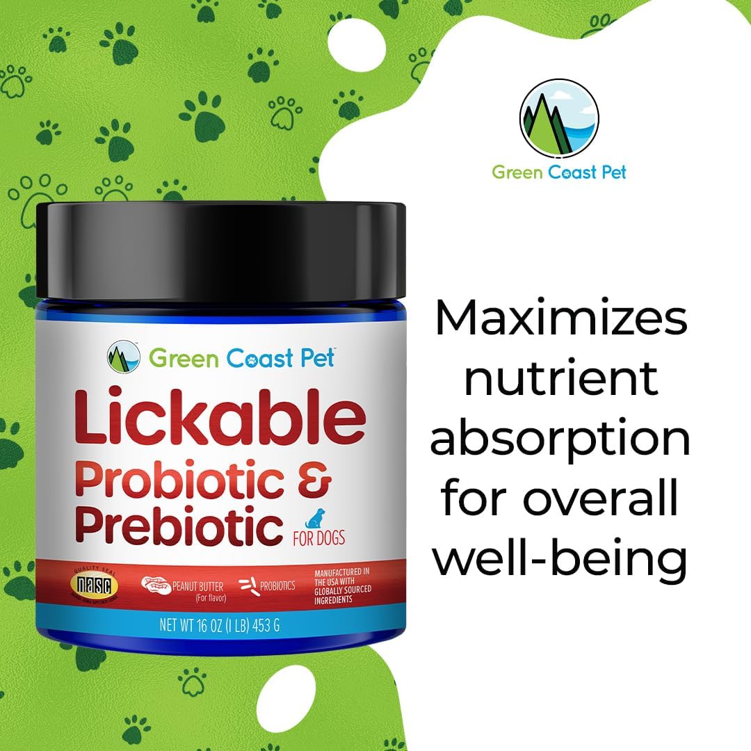 Does your picky does diegestive system need the support of probioitcs and prebiotics? Peanut Butter prebioitics and probiotics, a tasty combination that's great for your dogs digestive system. Green Coast Pet's Lickable Probitoic has only 1 inactive ingredient, ground peanuts which makes it great and tasty way to give a probiotic supplement to a dog that has allergies.